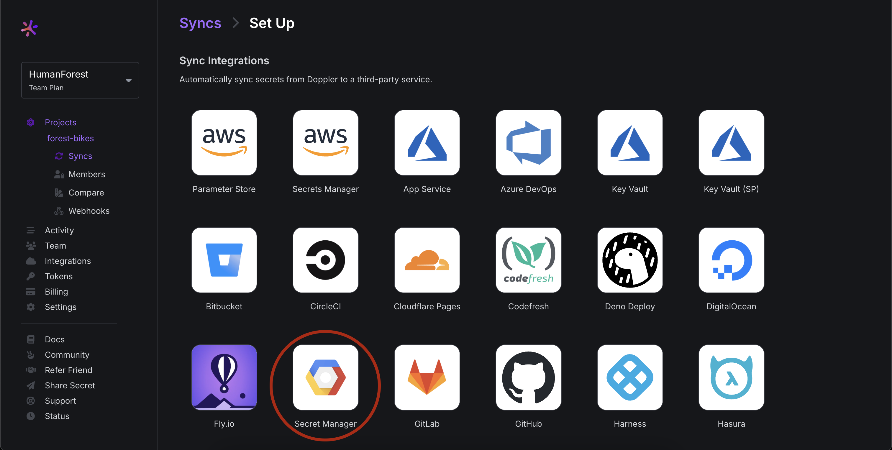 - Select Add Sync > GCP Secret Manager as the integration type.